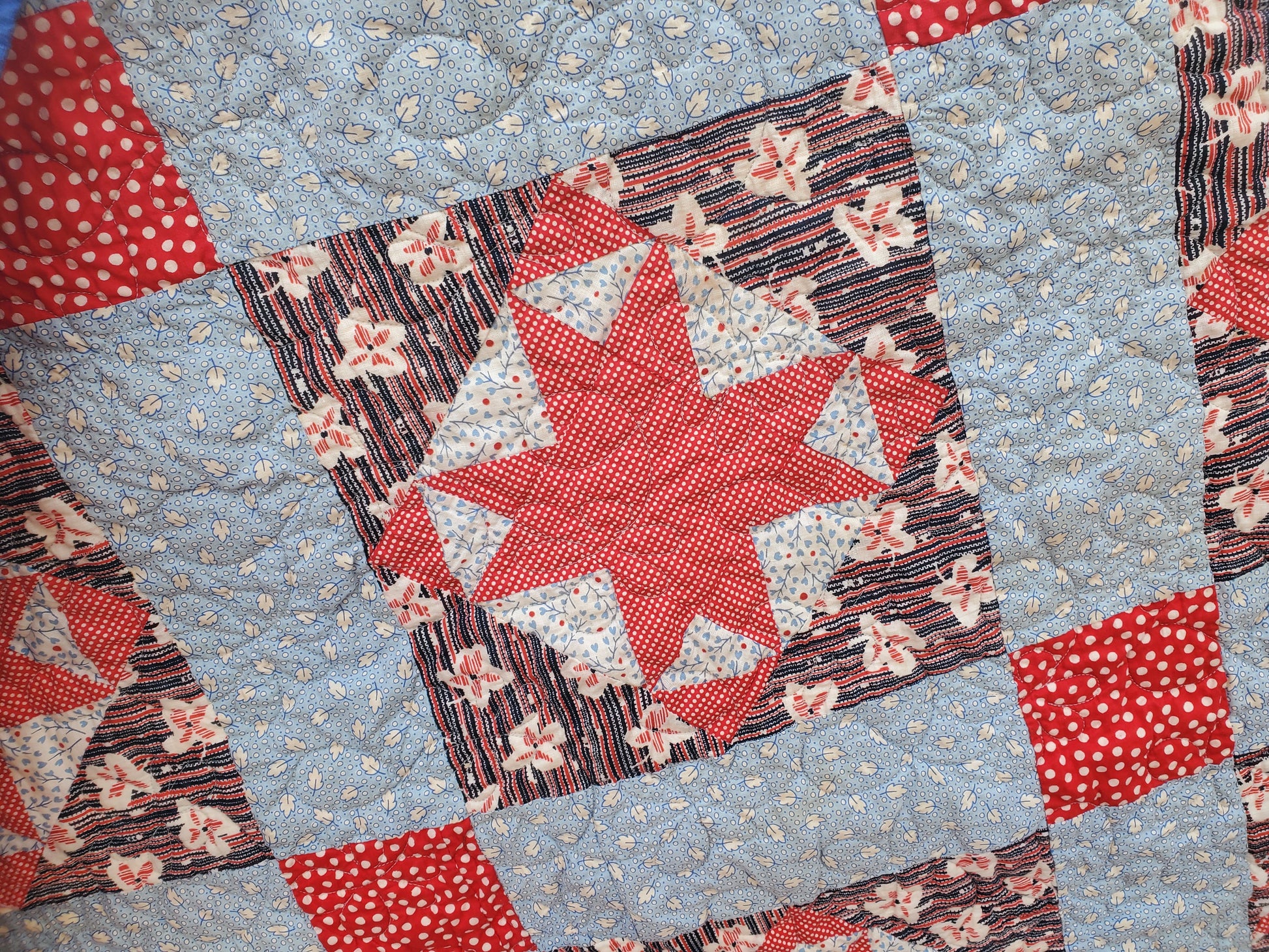 - Design: A 1940's-star themed quilt top is combined with coordinating new fabrics for a modern farmhouse feel.