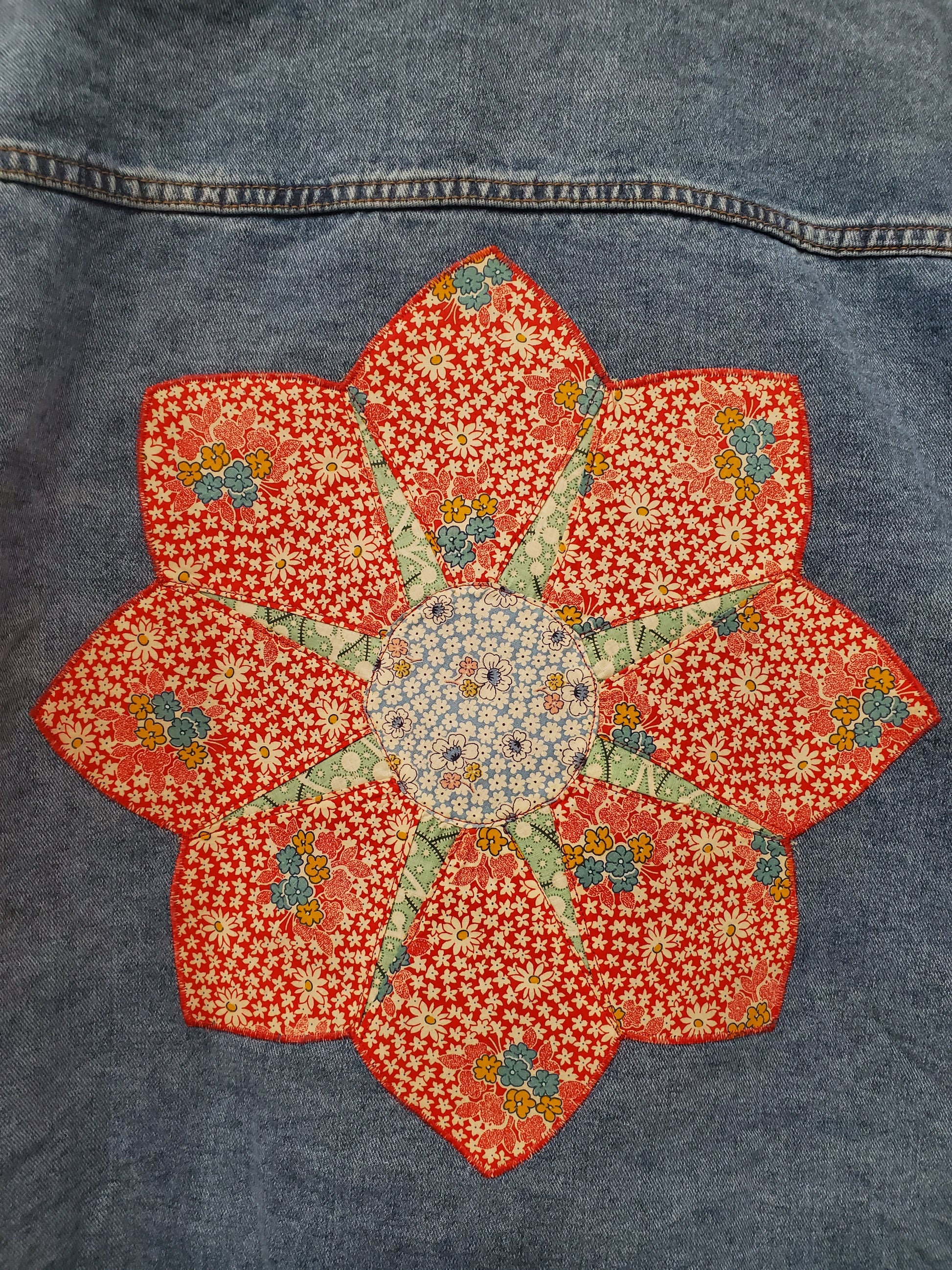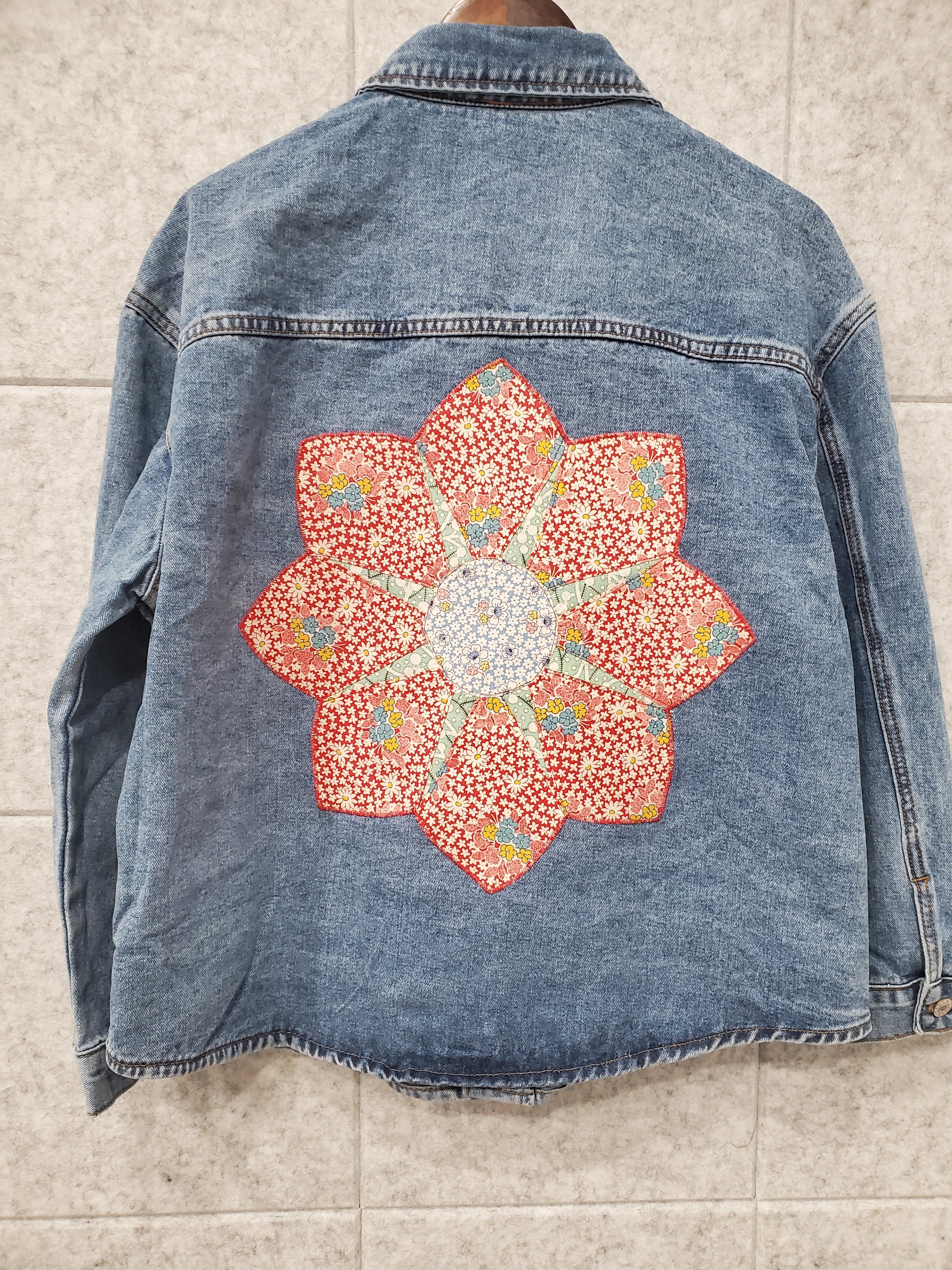 This one-of-a-kind denim jacket in a size LG carries a rescued hand-pieced vintage Flower quilt block on its back — a fragment of history lovingly revived and reimagined.